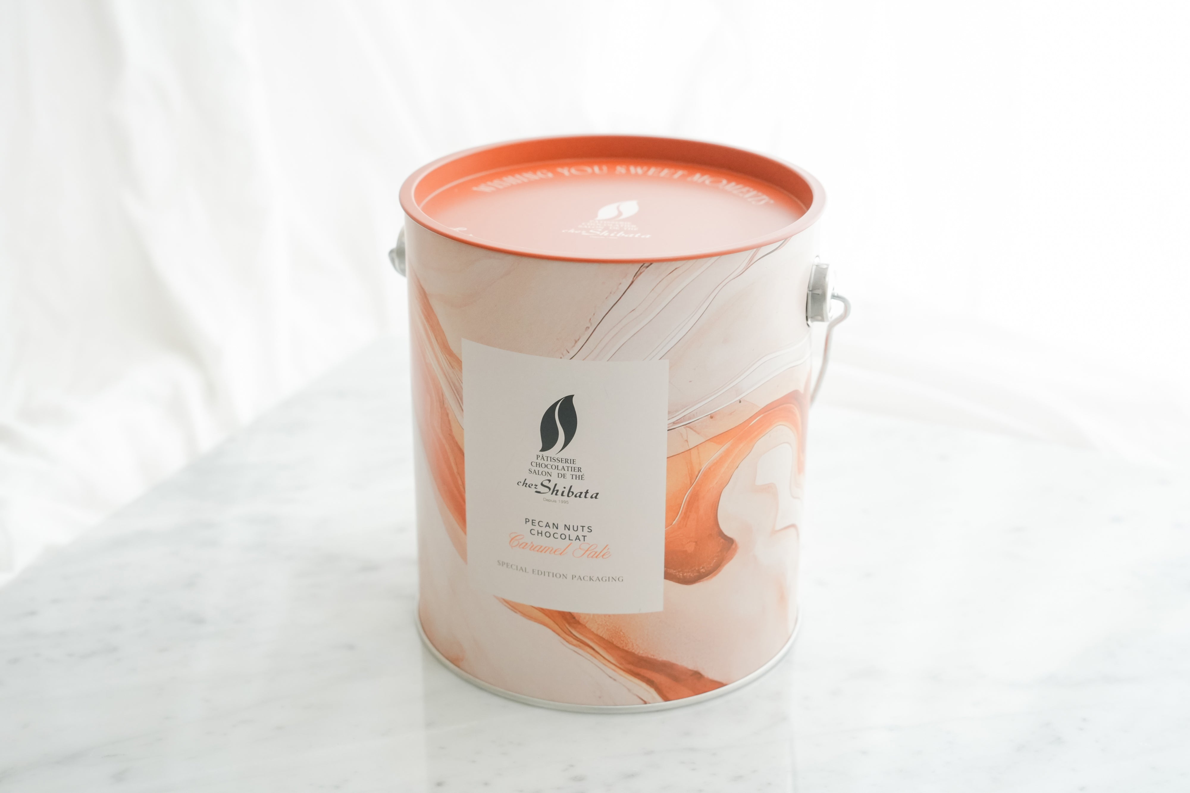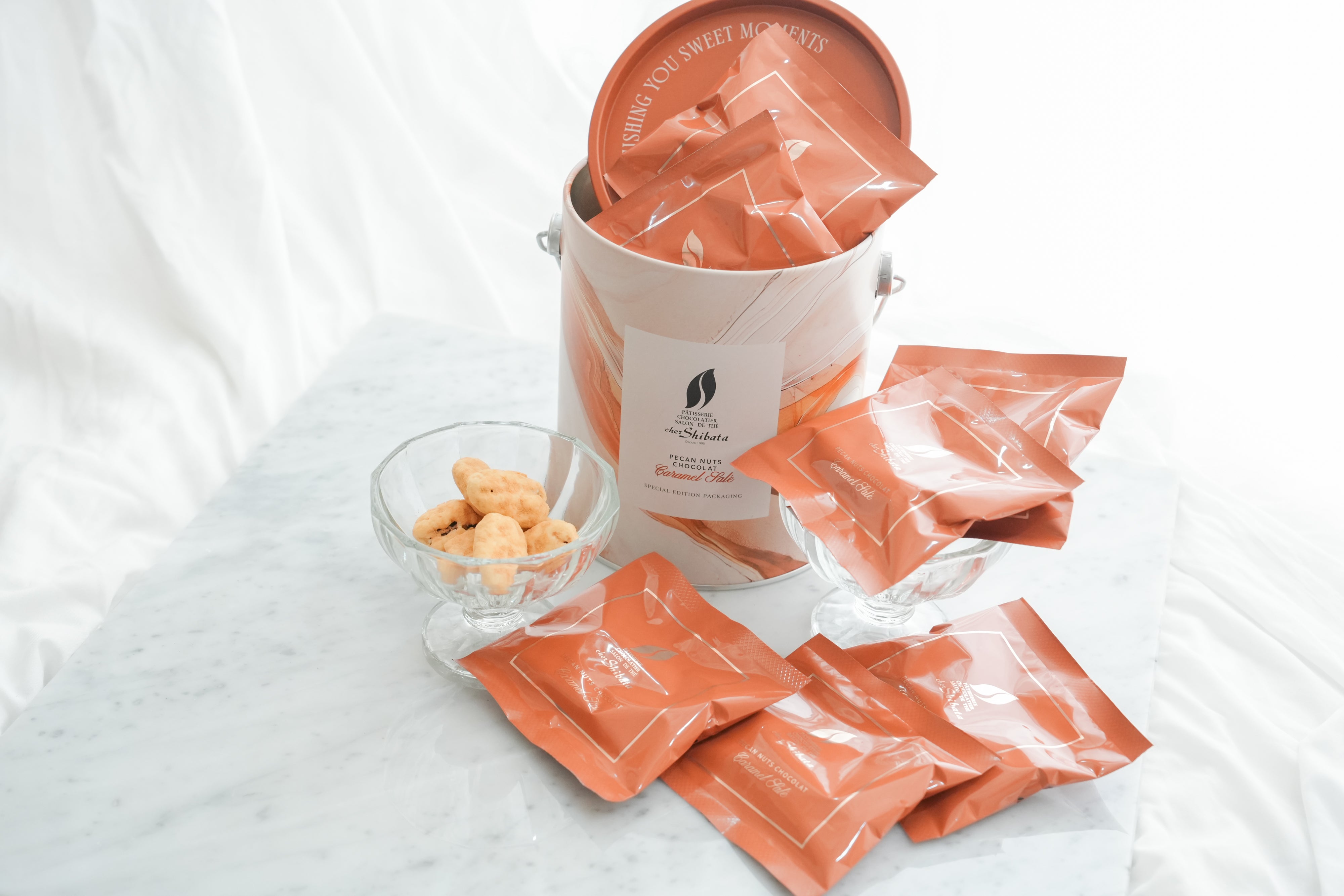大粒のペカンナッツをローストして、ホワイトチョコレートでコーティングし、塩キャラメルパウダーで仕上げました。