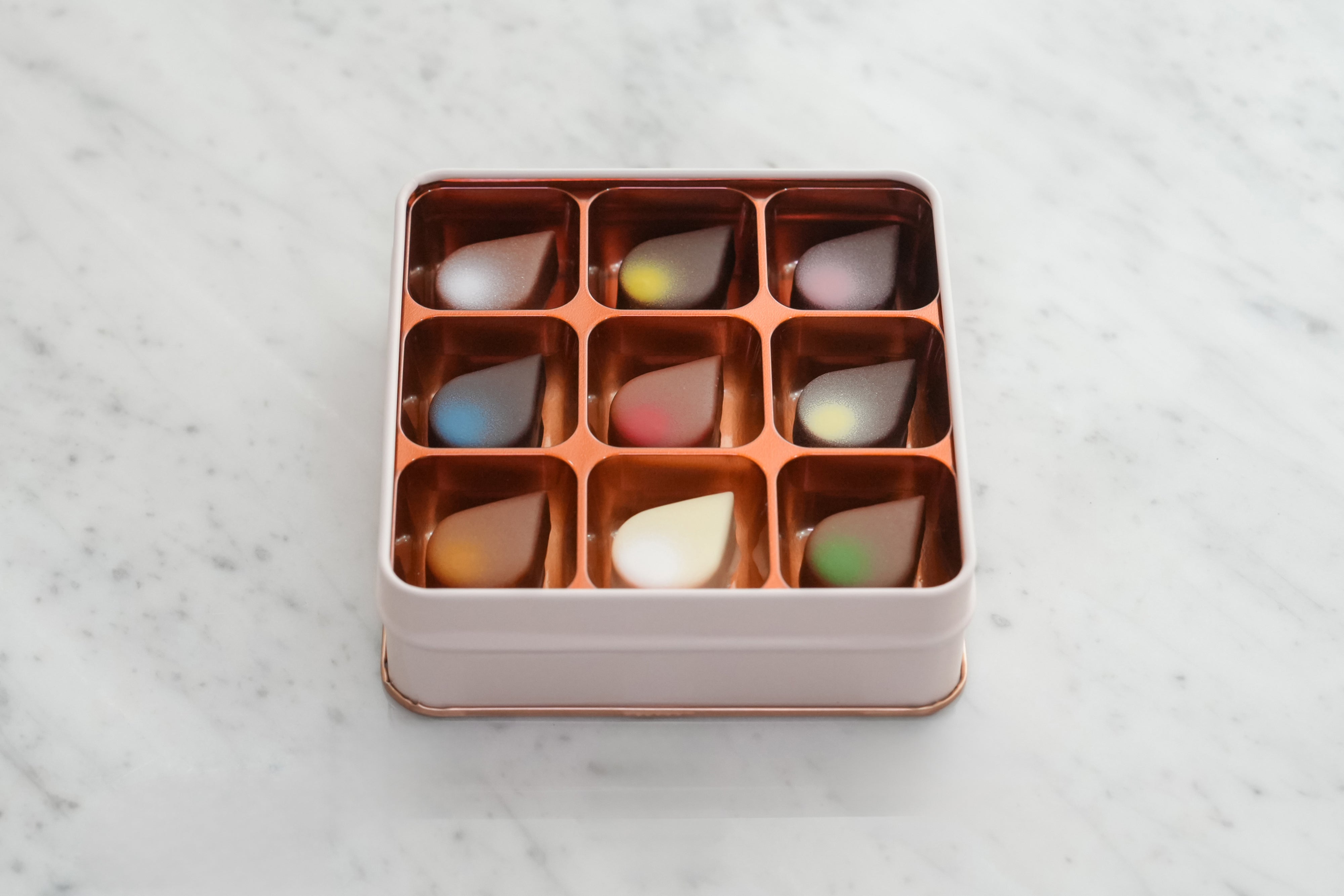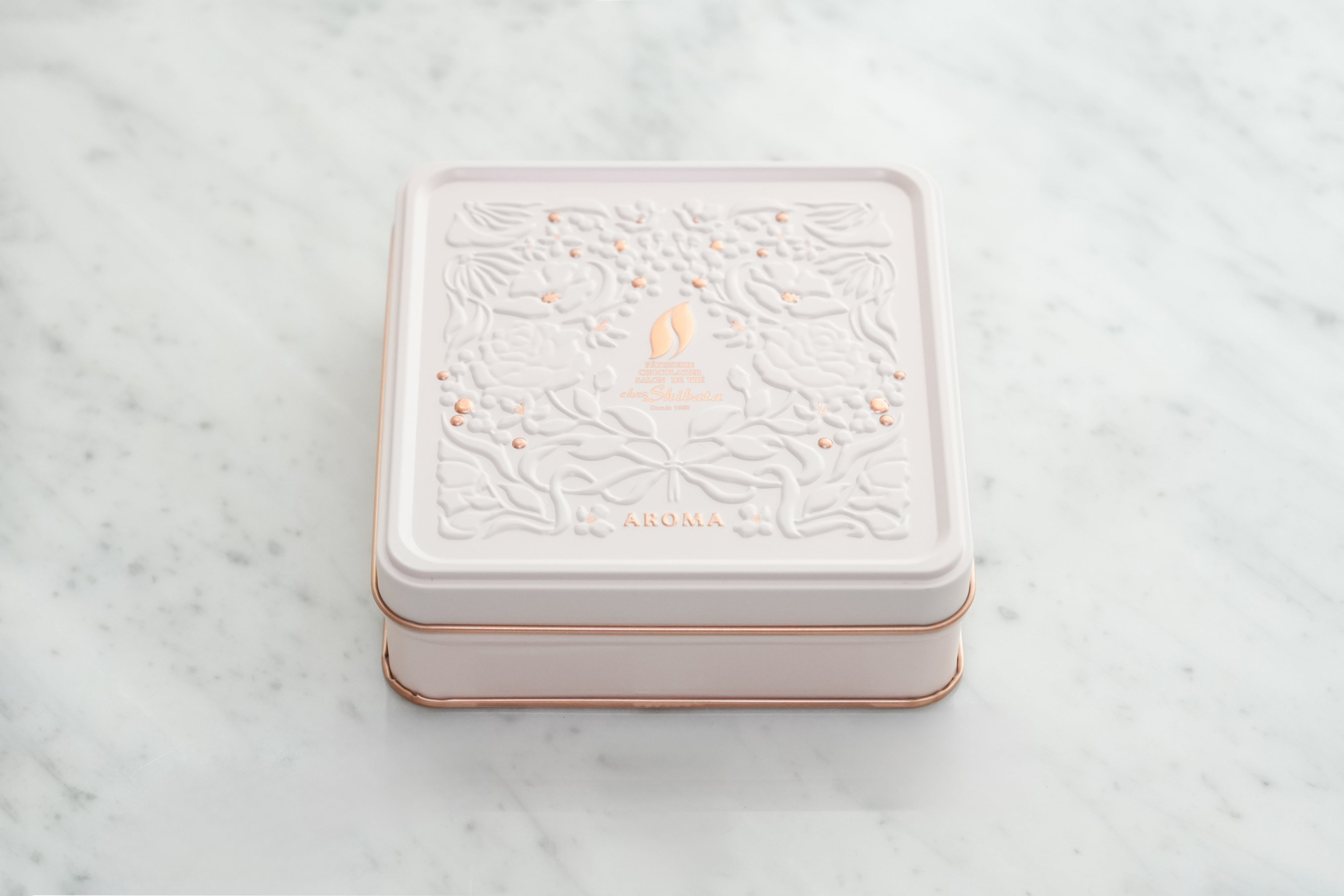 「アロマ(=香り)」をテーマにした芳香なボタニカルフレーバーのショコラ。ジャスミン&アプリコット、ミモザ&日向夏など、個性豊かなハーブやフラワーに相性の良いフルーツをそれぞれ合わせた9粒の詰合せ。