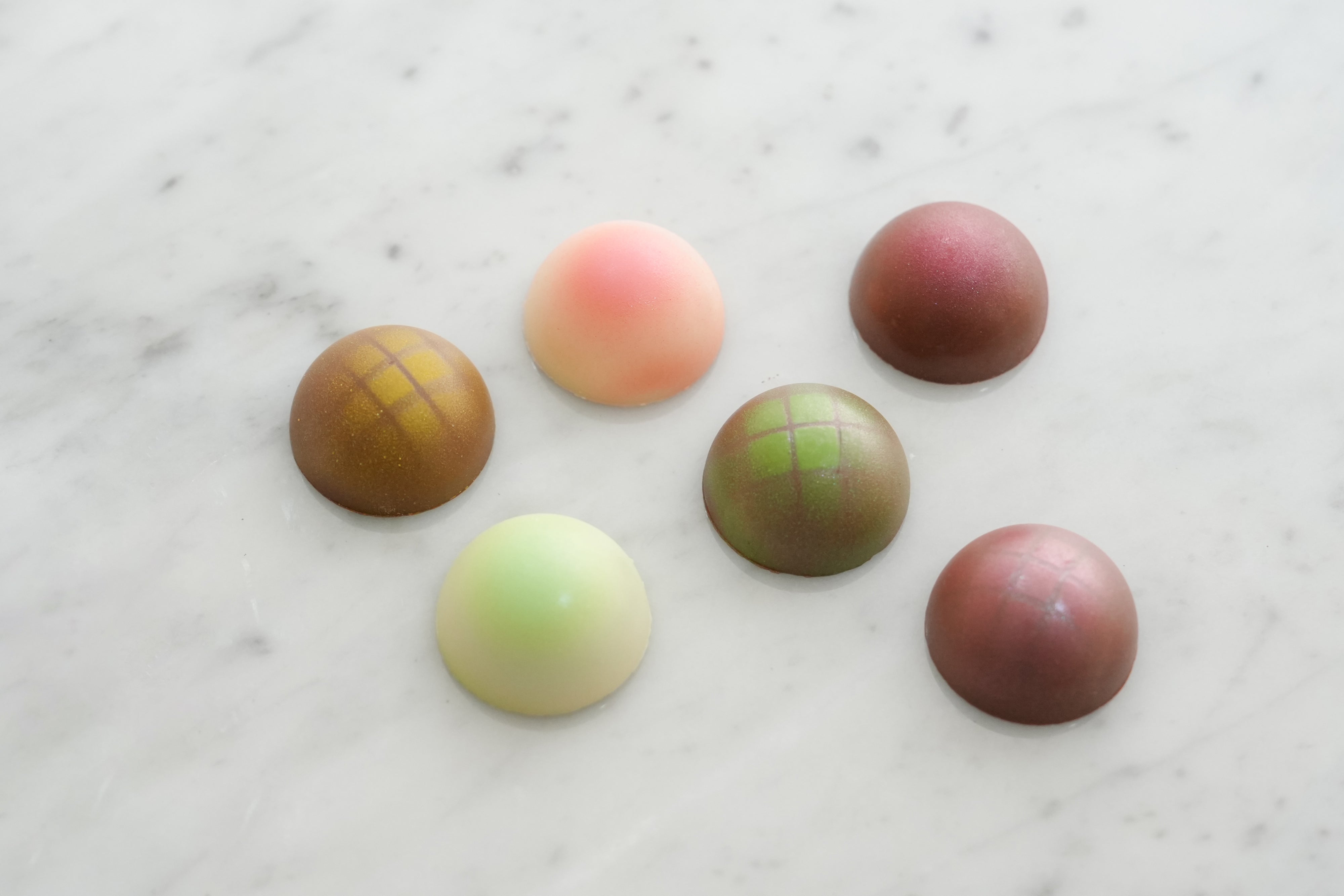 みずみずしいジュレが入った「佐藤錦」、「白桃」、「マスカット」と、ジュレとガナッシュが2層になった「マンゴーパッション」、「あまおうピスターシュ」、「柚子フロマージュ」の6種の詰合せです。