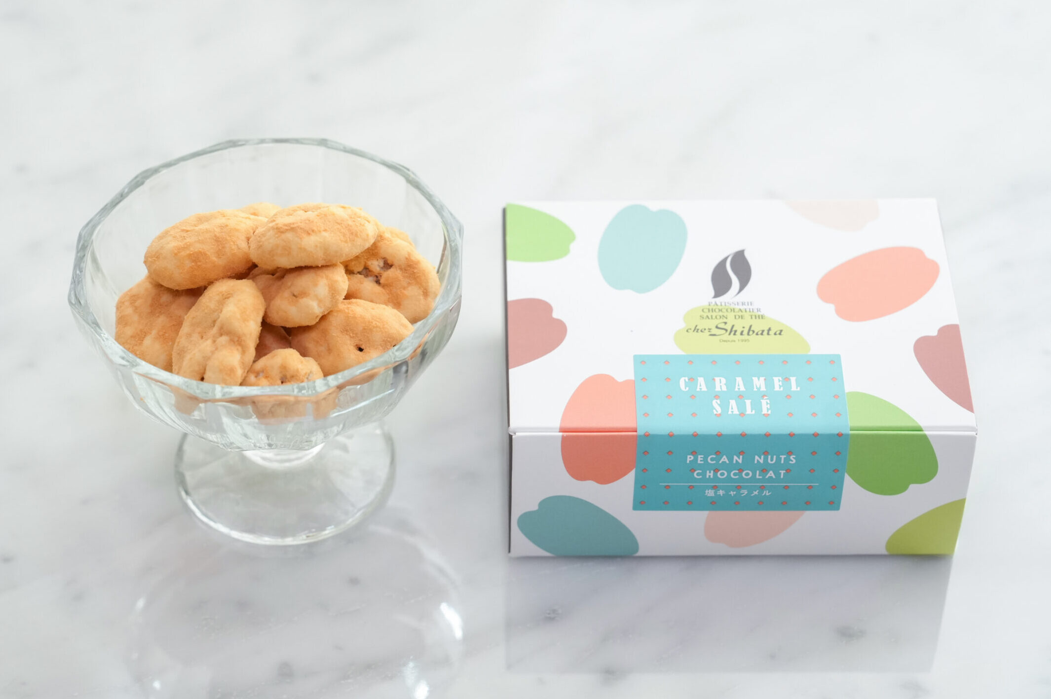 ローストした大粒のペカンナッツをホワイトチョコレートでコーティングし、キャラメルパウダーで仕上げました。
