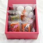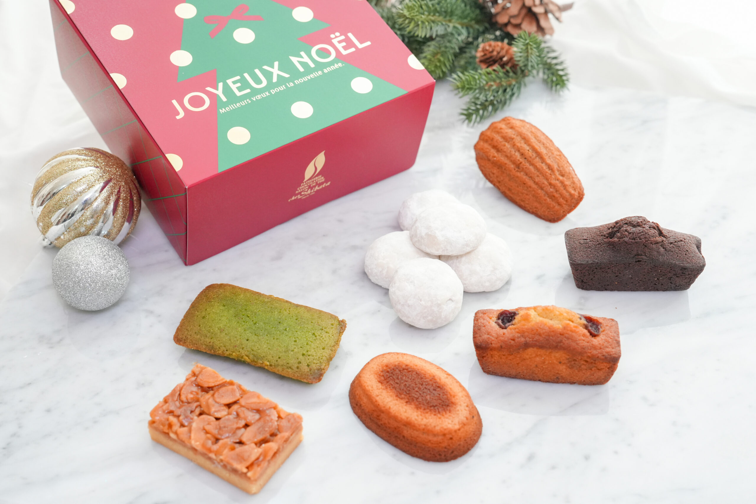 スペシャリテのヴィジタンティーヌ、雪玉をイメージしたクッキー「ブールドネージュ」など季節限定の焼菓子7種類をおしゃれなクリスマスデザインボックスに詰め合わせました。