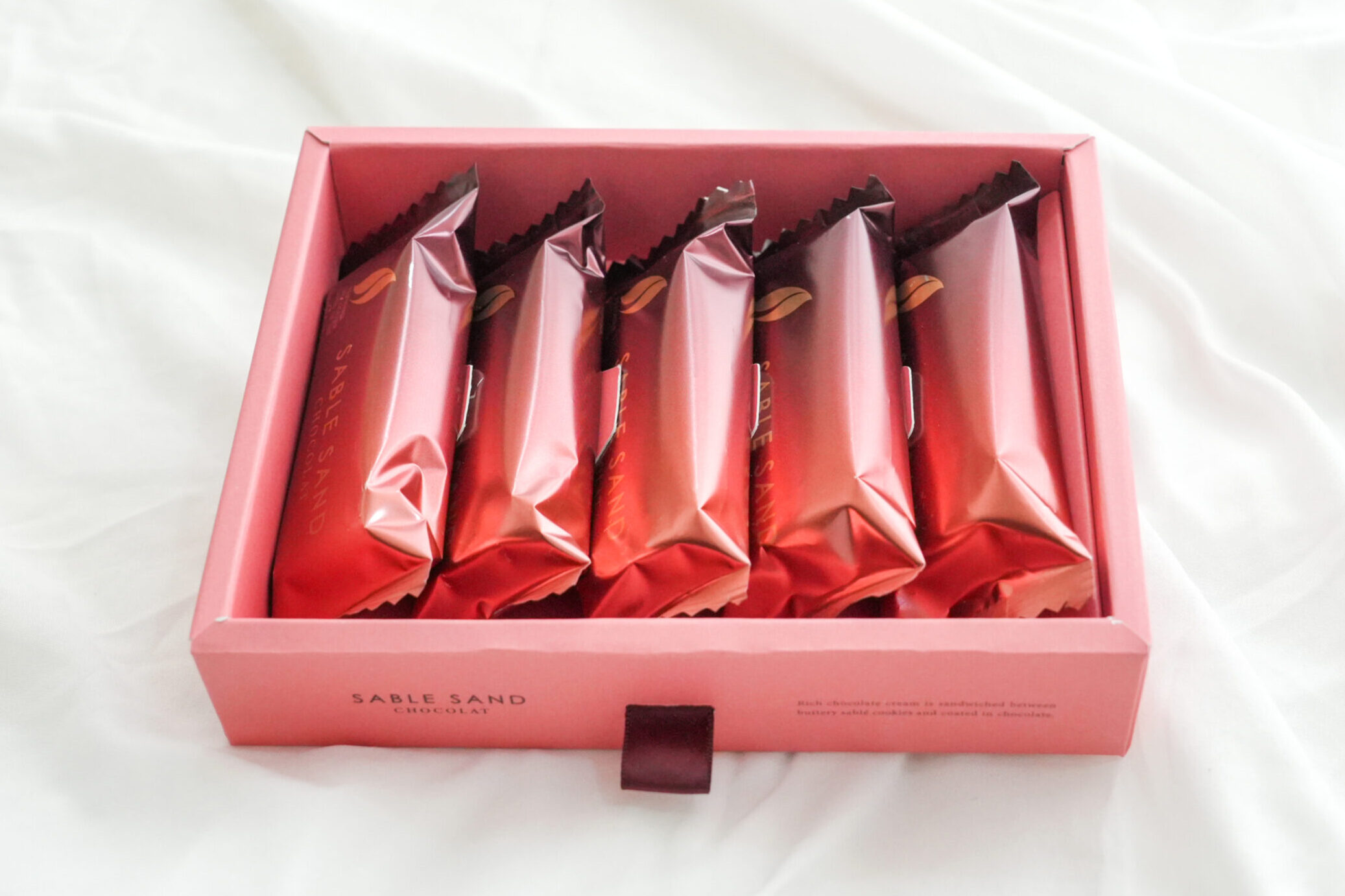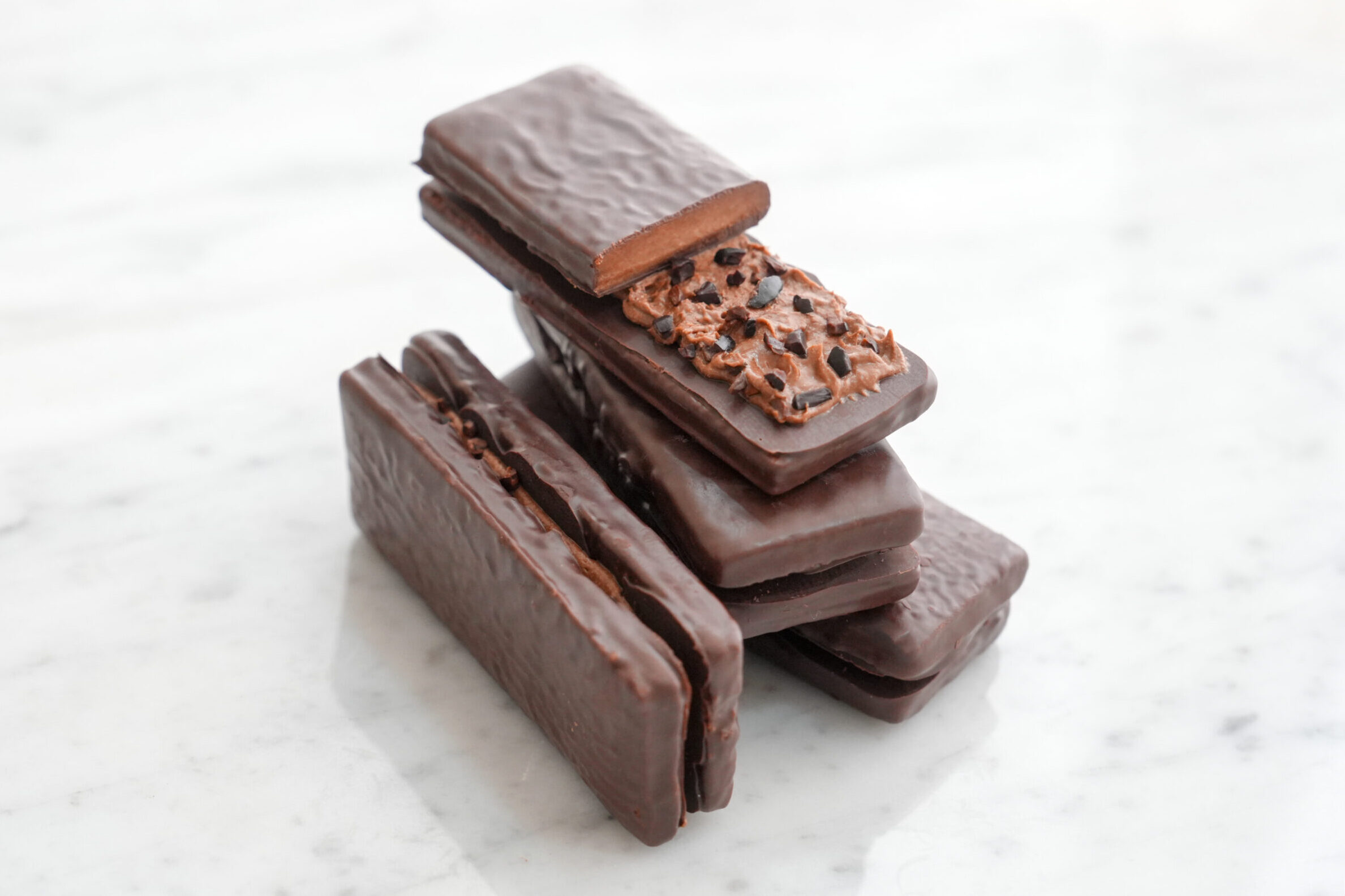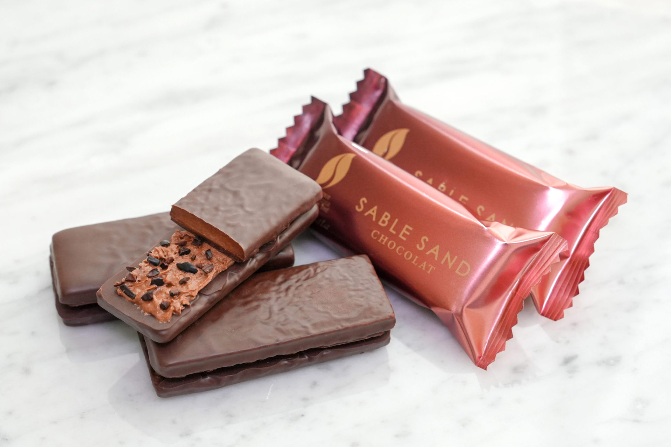 エクアドル産カカオ豆を使用したチョコレート(*)でコーティングしたバターサブレで、チョコレートクリームとカカオニブをサンドした、季節限定の特別なサブレサンドです。